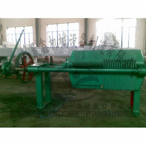 此設備廣泛應用于少量物料過濾,屬于進料量偏小的壓濾機,使用過濾面積在0.5—20m2,濾板外形尺寸:250mm—630mm,一般情況下進料壓力<0.5Mpa。手動壓緊壓濾機主要包括:手動液壓壓緊壓濾機;手動機械壓緊壓濾機。手動壓緊原理:是以螺旋式機械千斤頂或手動液壓缸推動中頂板將濾板壓緊。