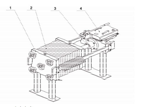 圖:1.壓濾機機架;2.過濾部分;3.液壓油缸;4.手動液壓站;